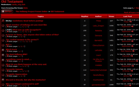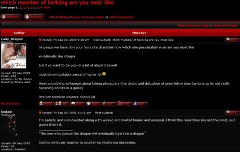 | We also find that the material written in each post can vary in content. Let’s click on the post for “which member of hellsing are you most like.” This title indicates the contents following will be a discussion among message board members about the characters in the manga “Hellsing” they most identify with. For some readers, this concept might seem fairly trivial; on the other hand, the readers taking part in this interactive discussion apparently felt that this airy topic would potentially create an ice-breaker. While a trivial concept, the subject brings a specific group of readers together to have a discussion about themselves without worrying about how far across the world each reader may be, relative to each other. The world becomes smaller, in a cliqued sense, for the readers of BoH’s “The Hellsing Project.” They meet thanks to the our friend, interaction. |