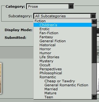 Cutting directly to the point, we will skip ahead through the log in process and dive into a search. DeviantART offers a menu of eLiterature to search for, and the reader is giving the choice of his or her own tastes for that particular visit. Just as a conventional reader enters the library in search of a mystery novel one day and a romance novel the next, the eReader enters DeviantART in search of an enticing piece of eLiterature. This card catalog of sorts allows the reader to "thumb" through the different types of eLiterature offered at DeviantART. Perhaps one day the reader is hungry for poetry. On this particular day, the reader desires to devour a piece of eProse. The reader selects "Prose" on the menu, and awaits the resulting subheadings. What a wonderful display of simplicity, visibility, multiplicity, materiality, and interaction we find all rolled into one menu.
