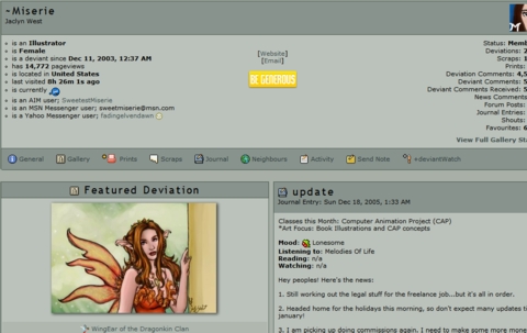 Now that we have explored the multitude of eLiterature we can find on DeviantART, let’s delve into information about some of the authors. I found an author who uses the nickname “Miserie” for her account. Jaclyn West’s information can be found on this first page of her personal section of the eLibrary. We can learn that she is an illustrator by self-proclamation, read her weblog discussing whatever personal or impersonal information she chooses to share with her audience, view her artwork, and even find links to other authors she associates with. The beauty of DeviantART is that an author can befriend and associate with other authors and interact on a different level from the conventional author. The quality of interaction is a many forked road on which millions and millions of people, readers and authors alike, can congregate, learn more about each other, and share works and ideas with one another. |