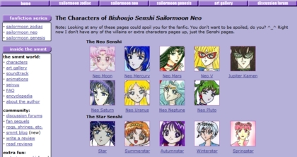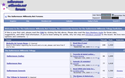 | As our exploration of Janelle J.’s “Sailor Moon Millenia Trilogy” comes to a close, we will visit the forum she has provided her readers with to voice their opinions, interact with other readers, and share other information. This ability to interact with the author and other readers so easily despite locational distances is a quality fairly exclusive to eLiterature. Conventional books, magazines, newspapers, etc. aren’t as easily accessible, and the accessibility range tends to be confined to one’s own traveling radius. Without a source of transportation and the proper connections, one cannot interact so easily with authors and readers of conventional literature. The ability to interact brings the world fairly closer together relatively. Hopefully this exhibit has served the purpose to introduce the qualities of simplicity, visibility, creativity, materiality, and interaction as these qualities will later be showcased in the following exhibits. |
