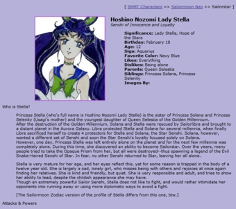 Now that we have entered into a profile of a new character introduced to the canon cast in Sailor Moon Neo, we can pick apart the qualities and information provided within. Each profile comes with a character image, the character’s significance in the story, a birthday, age, sun sign, favorite color, likes, dislikes, family, a short biography, and a description of the character’s “attacks.” The reader can fairly quickly find the qualities of simplicity, visibility, creativity, and materiality all present in each profile for each individual character: the information is provided in a simple, easily accessible format; the reader can visualize the character, both in appearance and personality; Janelle creates a new character to add to the canon cast; and the new character becomes a tangible individual in the story. |